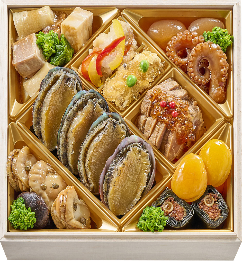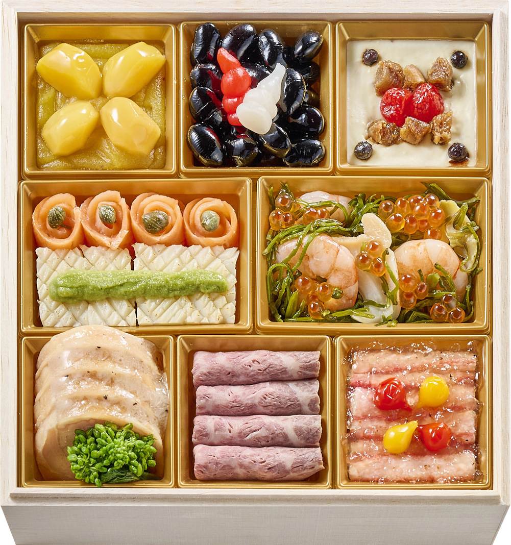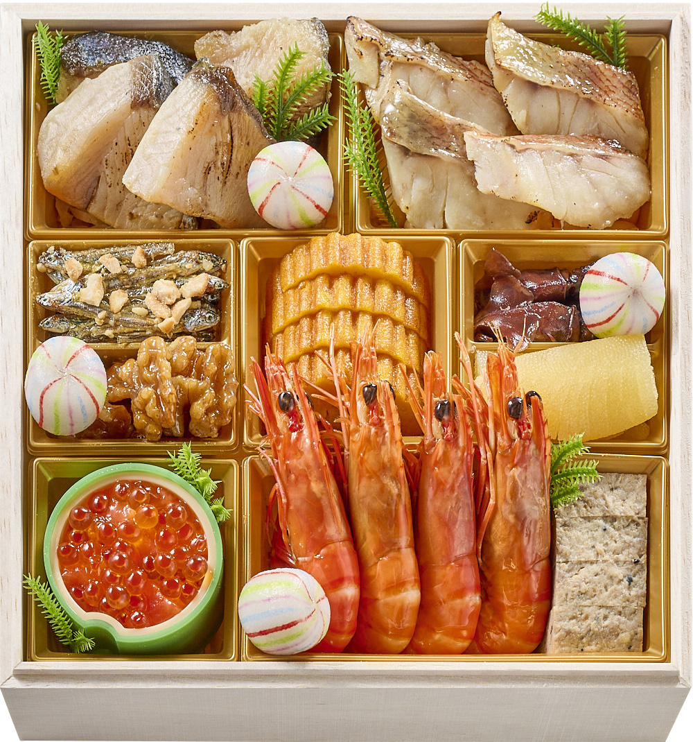 ①鰤塩麹焼②大根田舎煮③手毬餅④赤魚西京焼⑤大豆やわらか煮⑥田作りカシューナッツ和え⑦くるみ甘露煮⑧伊達巻柚子風味⑨ほたるいかしぐれ煮⑩数の子醤油漬⑪鮭ルイベ漬いくら掛け⑫海老旨煮⑬和風ミートローフ