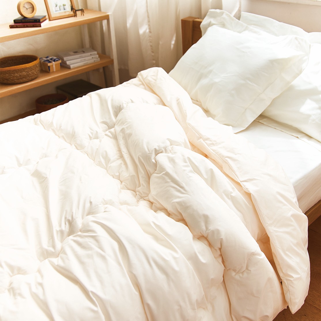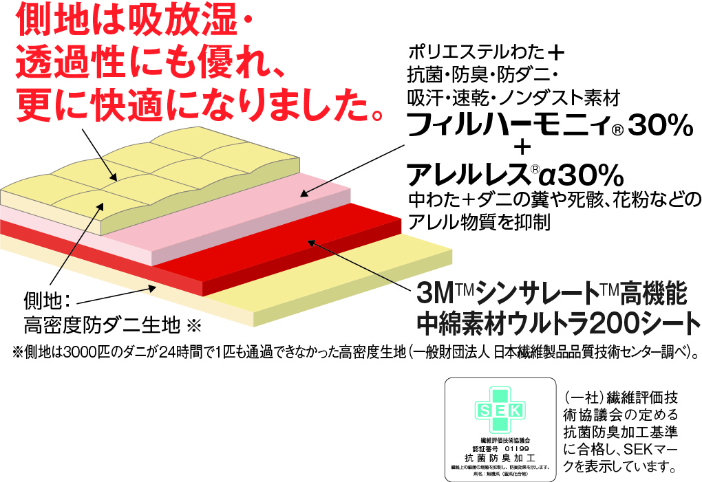 さらに中綿に抗菌・消臭・防ダニ・吸汗・速乾素材の「フィルハーモニィ®」と、アレル物質抑制&抗菌効果を備えた機能素材「アレルレス®アルファ」を追加。ダニの糞や死骸、花粉などのアレル物質を抑制します。さらに側地には薬剤不使用で、24時間テストでダニを1匹も通さなかった高密度生地を使用。