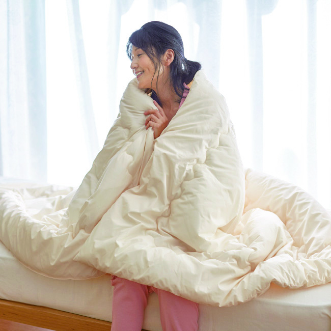さらに中綿に抗菌・消臭・防ダニ・吸汗・速乾素材の「フィルハーモニィ®」と、アレル物質抑制&抗菌効果を備えた機能素材「アレルレス®アルファ」を追加。ダニの糞や死骸、花粉などのアレル物質を抑制します。さらに側地には薬剤不使用で、24時間テストでダニを1匹も通さなかった高密度生地を使用。
