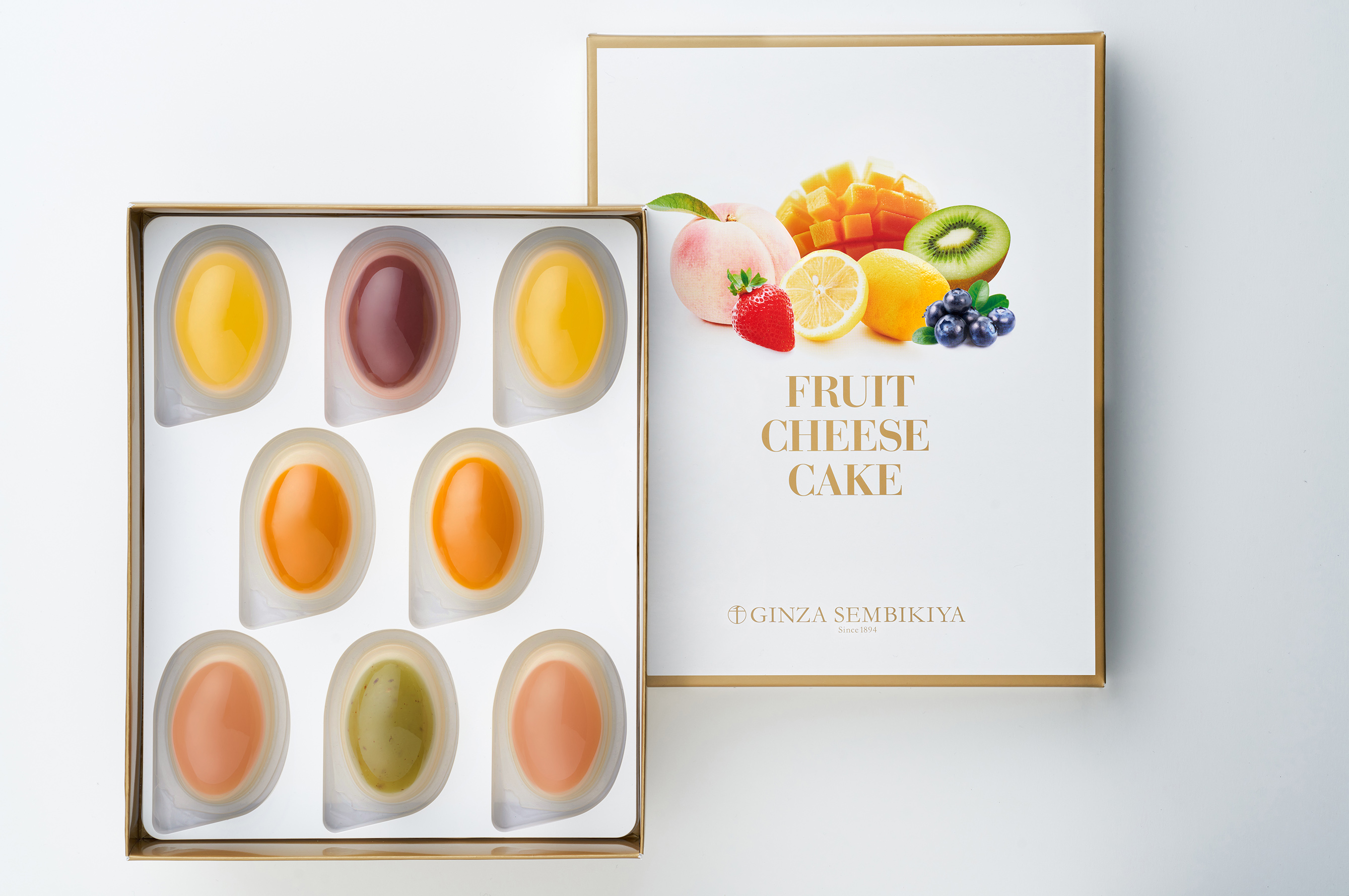 レアチーズケーキにピーチやマンゴーなどのソースを合わせた、「銀座千疋屋」のフルーツレアチーズケーキの詰合せです。